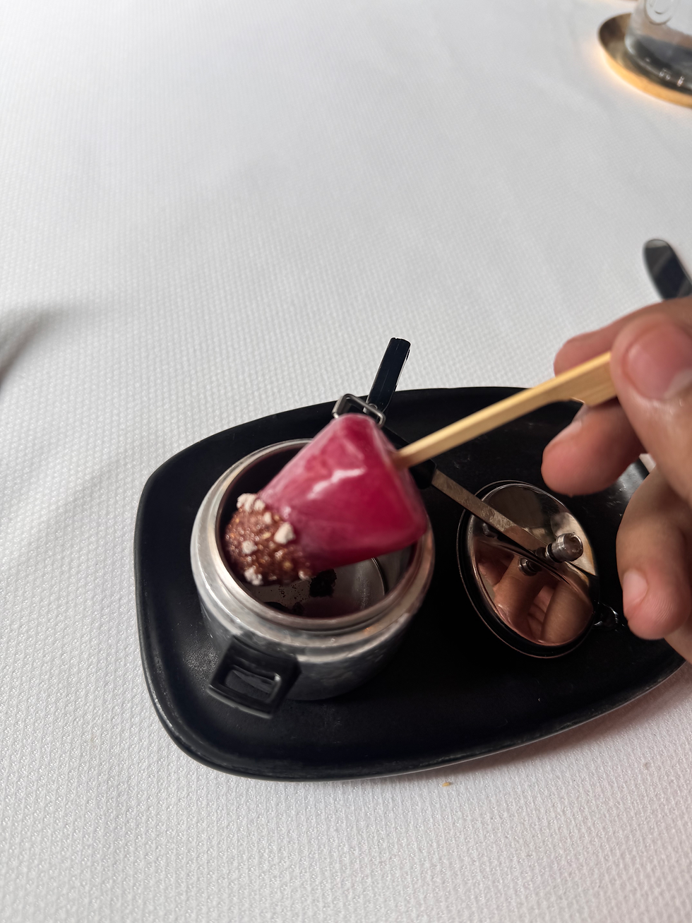 From the Chef's Tasting Menu, the kitchen then brought out the motichoor ladoo — and this is where expectations need to be recalibrated before it arrives, because it bears little resemblance to the gram flour sweet you know from every mithai shop you have ever visited. The outer boondi shell is there, familiar and golden, but inside sits a cream cheese filling encased in a white chocolate shell. It is a genuinely clever piece of cooking. The cream cheese brings a slight tang that cuts through the sweetness of the boondi, and the white chocolate acts as a bridge between the two rather than adding more sugar to an already sweet thing. It looks like a ladoo. It surprises you like almost nothing else on the menu.