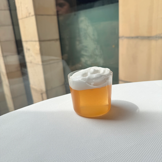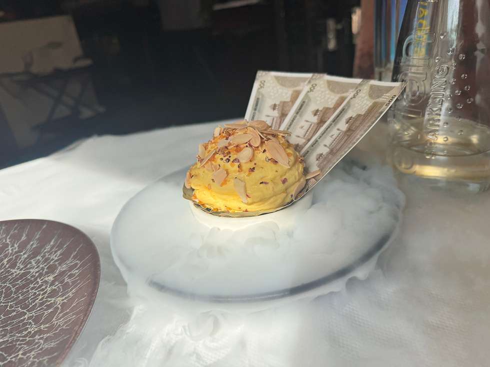 Then came the daulat ki chaat, and if the motichoor ladoo is a surprise, this is something closer to an experience. Indian Accent uses nitrogen capsules to cool the milk before whisking the foam, finishing it with nuts and candied rose petals, and serving it in a terracotta pot exuding cold smoke. Daulat ki chaat in its street form is a Chandni Chowk winter delicacy — milk churned for hours until it produces an impossibly light, barely-there froth that dissolves the moment it reaches your tongue. The kitchen's version honours that essential quality, that weightlessness, while adding enough theatre and refinement to make it feel at home in this dining room. It is the most Delhi thing on the menu and one of the best things we ate all evening.