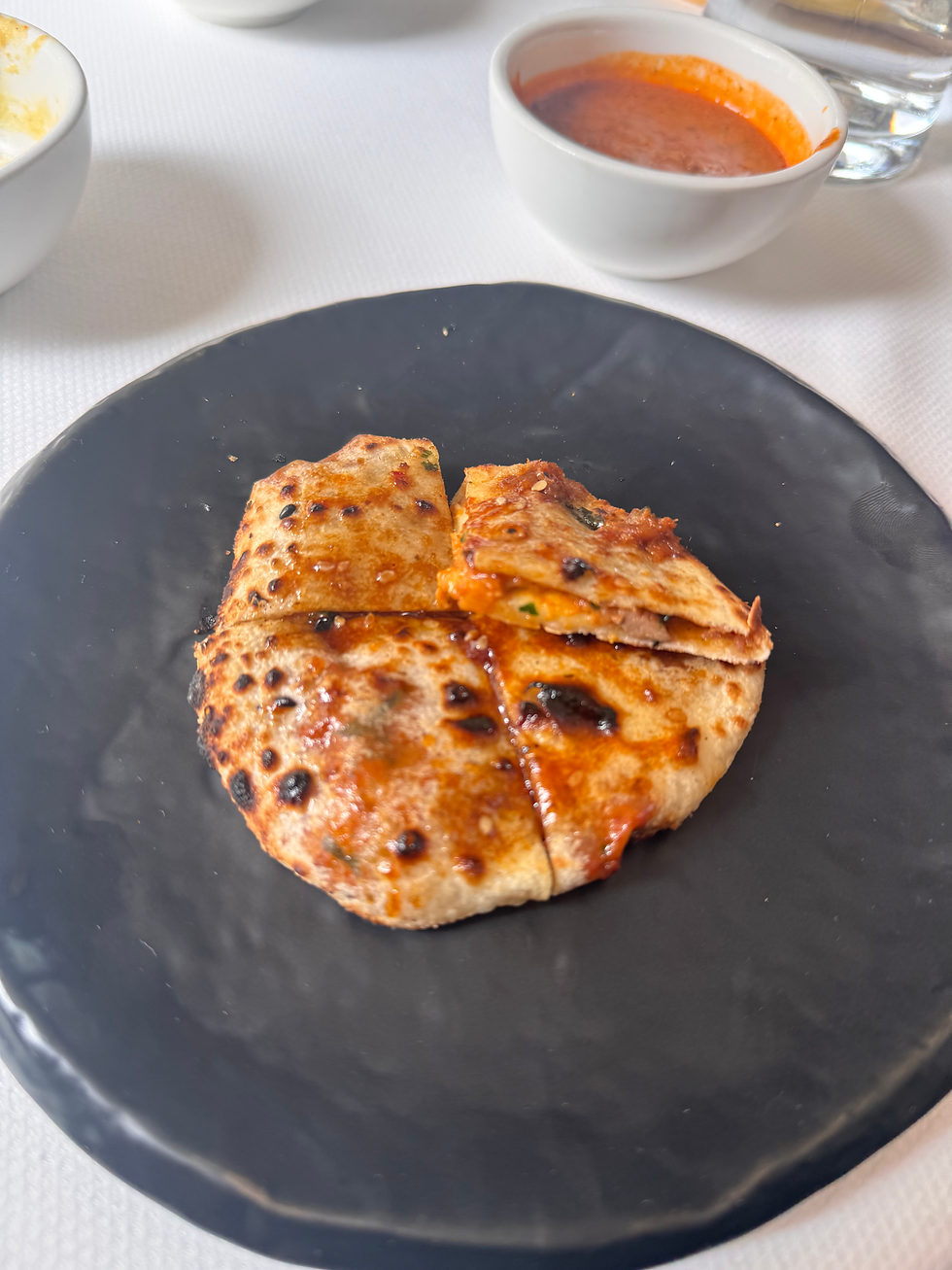 The butter chicken kulcha is arguably the dish that made the bread bar famous. The filling is exactly what it sounds like — real, properly made butter chicken, rich and tomato-forward and gently spiced, enclosed in a soft, lightly charred kulcha. The ratio of bread to filling is right. You get enough of the gravy to understand what you are eating without the whole thing becoming unwieldy. It is nostalgic and precise at the same time, which is a combination this kitchen understands better than most.